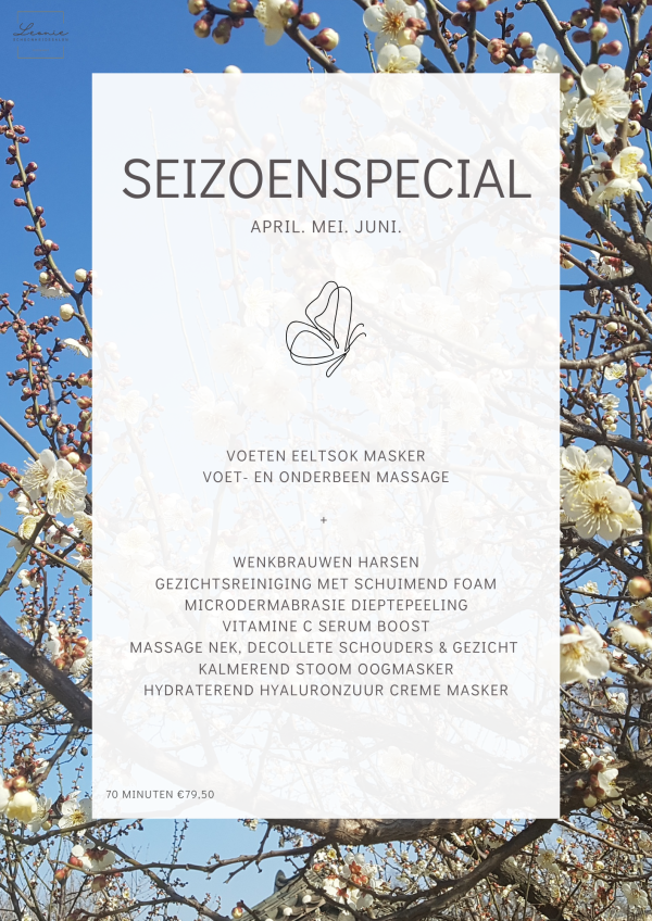 Ieder kwartaal is er een speciale behandeling, genaamd de seizoensspecial. Een heerlijke behandeling aangepast aan het seizoen. Deze behandeling bestaat altijd uit een combinatie van een gezichtsbehandeling met een hand of voet of lichaamsbehandeling. Laat je verrassen!